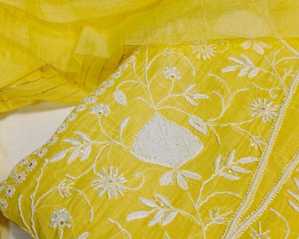Elegant Pure mul chanderi suit with CHIKANKARI work and pearl highlighted ari work