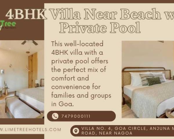 This 4BHK villa near the beach features a private pool and an entertainment-ready space perfect for families and groups in Goa. The villa includes four spacious bedrooms, a lounge area with games and media options, and a poolside setup ideal for evening hangouts or small celebrations. With the beach nearby for daytime fun, guests can enjoy a mix of relaxation, entertainment, and private family or group bonding.