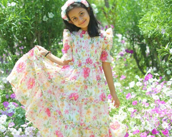 Enchanting Fairytale Ruffle Dress for girls ages 3-8 years. Floral printed georgette maxi with tiered ruffles, puff sleeves, and polyester lining offers flowy elastic comfort for birthday parties and special occasions. Pink-white floral print in sizes 3-8 Years. Grab 50% off sitewide now!